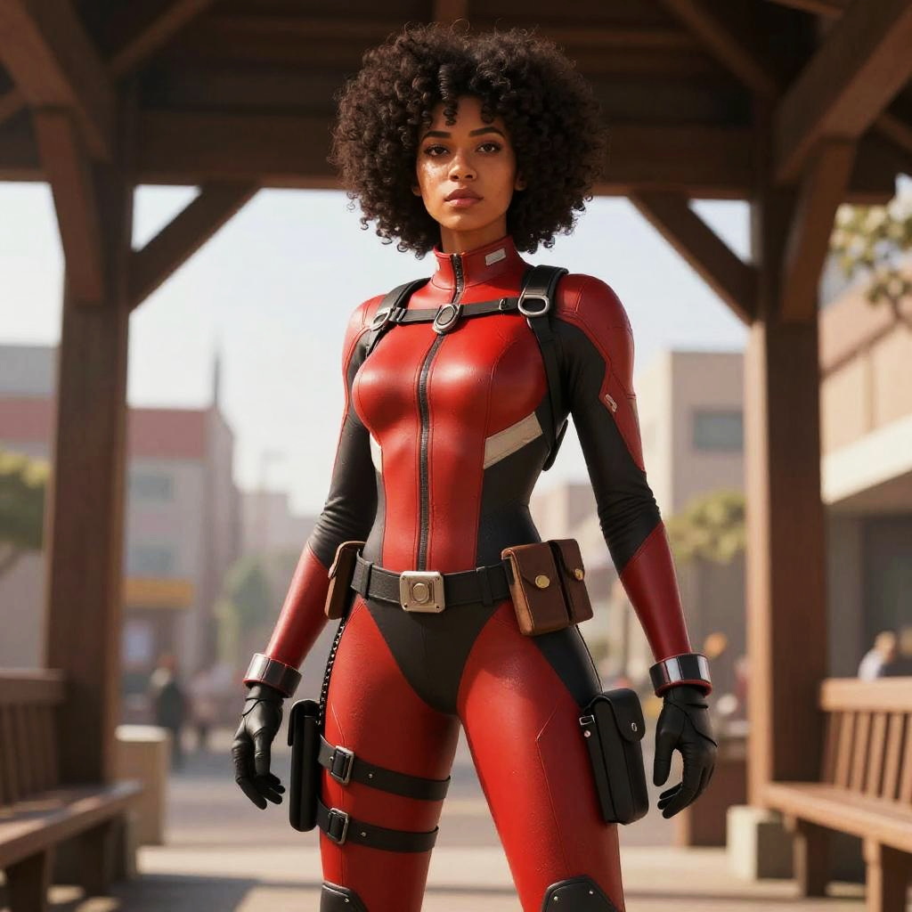 A confident woman dressed in a sleek red and black tactical bodysuit stands under a wooden structure in an urban setting. The outfit features detailed harnesses, belt pouches, and gloves, suggesting a futuristic or superhero style with a focus on readiness and agility.