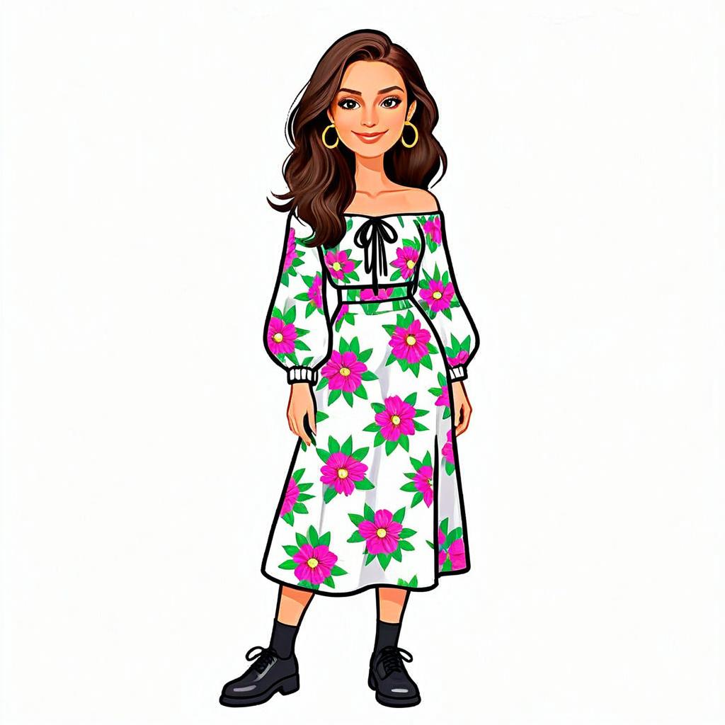 This illustration features a woman with long, wavy brown hair and a warm smile, dressed in a boho-chic style. She wears an off-shoulder white dress adorned with bright pink floral prints and green leaves, paired with black socks and shoes, embodying a fresh and fashionable look.