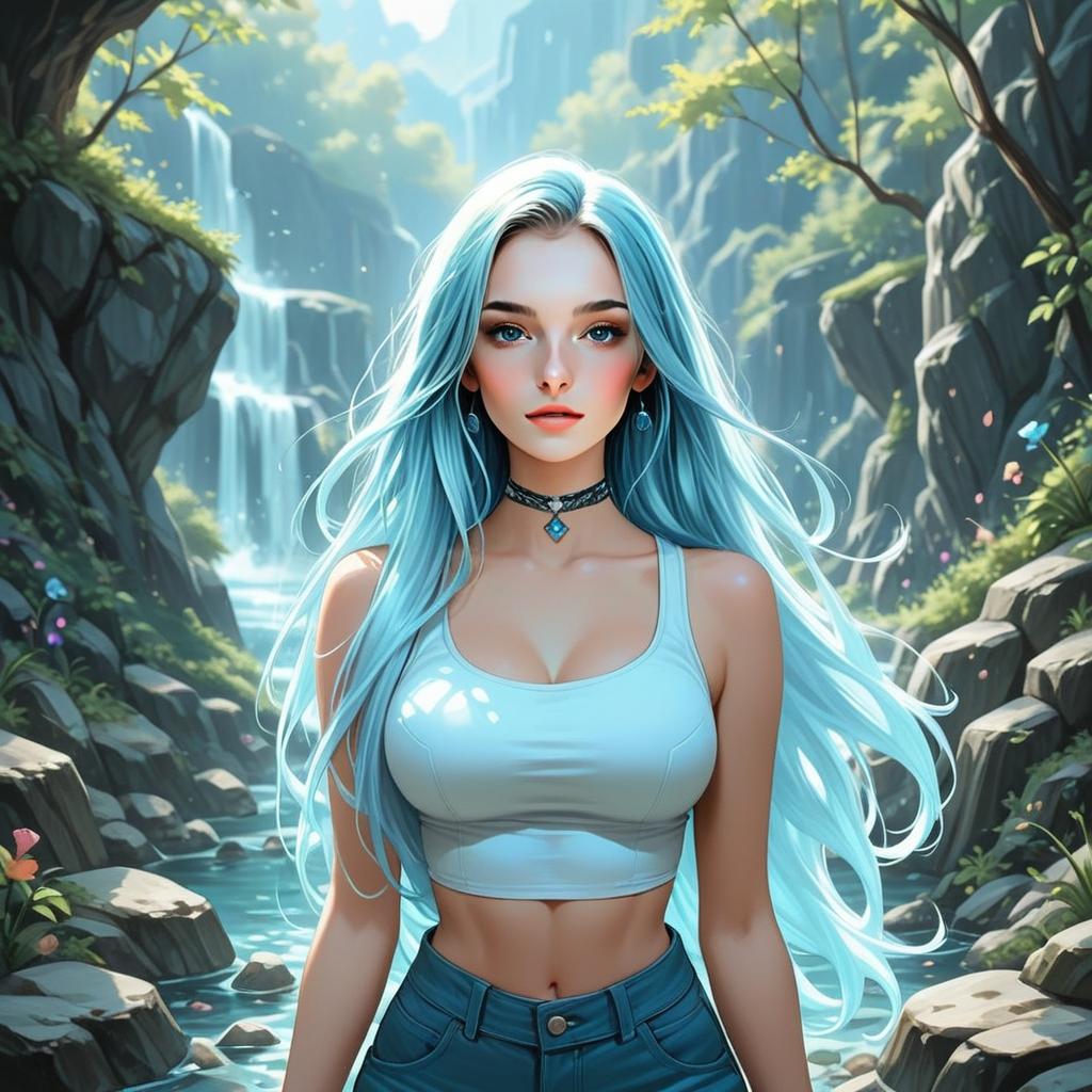 A stunning digital illustration of a young woman with long, flowing blue hair standing in front of a serene waterfall landscape. The artwork features vibrant colors and a detailed fantasy style, capturing the ethereal beauty of both the character and the natural background.