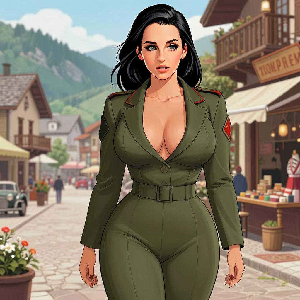 A digitally illustrated woman stands confidently in a military-style olive green jumpsuit, set against a charming mountain village backdrop. The artwork features a highly stylized, modern comic or graphic novel style with vibrant colors and detailed shading that emphasize the strong, attractive character and scenic environment.