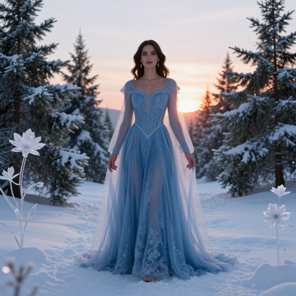 A woman stands gracefully in a snowy forest at sunset, wearing an elegant, flowing blue gown with intricate lace details and sheer long sleeves. The serene winter landscape and soft light create a magical, fairy-tale atmosphere, accentuated by the delicate floral elements in the snow.