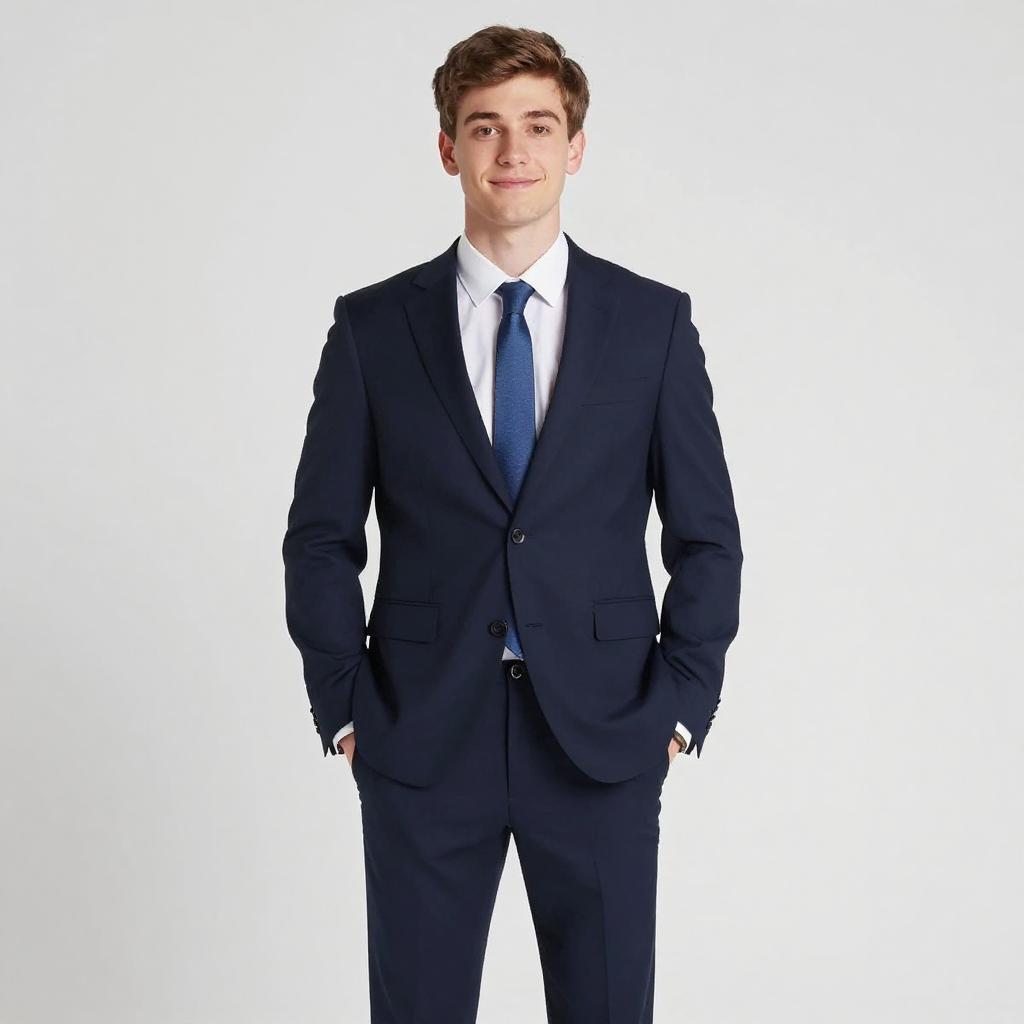 A young man dressed in a sharp, navy blue suit with a matching blue tie stands confidently against a plain light background. His relaxed posture and slight smile convey a sense of professionalism and approachability, ideal for corporate or business-themed imagery.