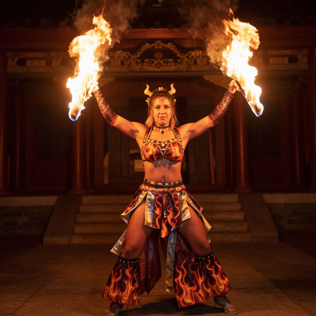 A woman dressed in a fiery-themed costume performs an impressive fire dance with flames blazing from both of her raised hands. She stands confidently in front of a dimly lit ornate structure, showcasing her strength and skill in a dramatic and theatrical performance.