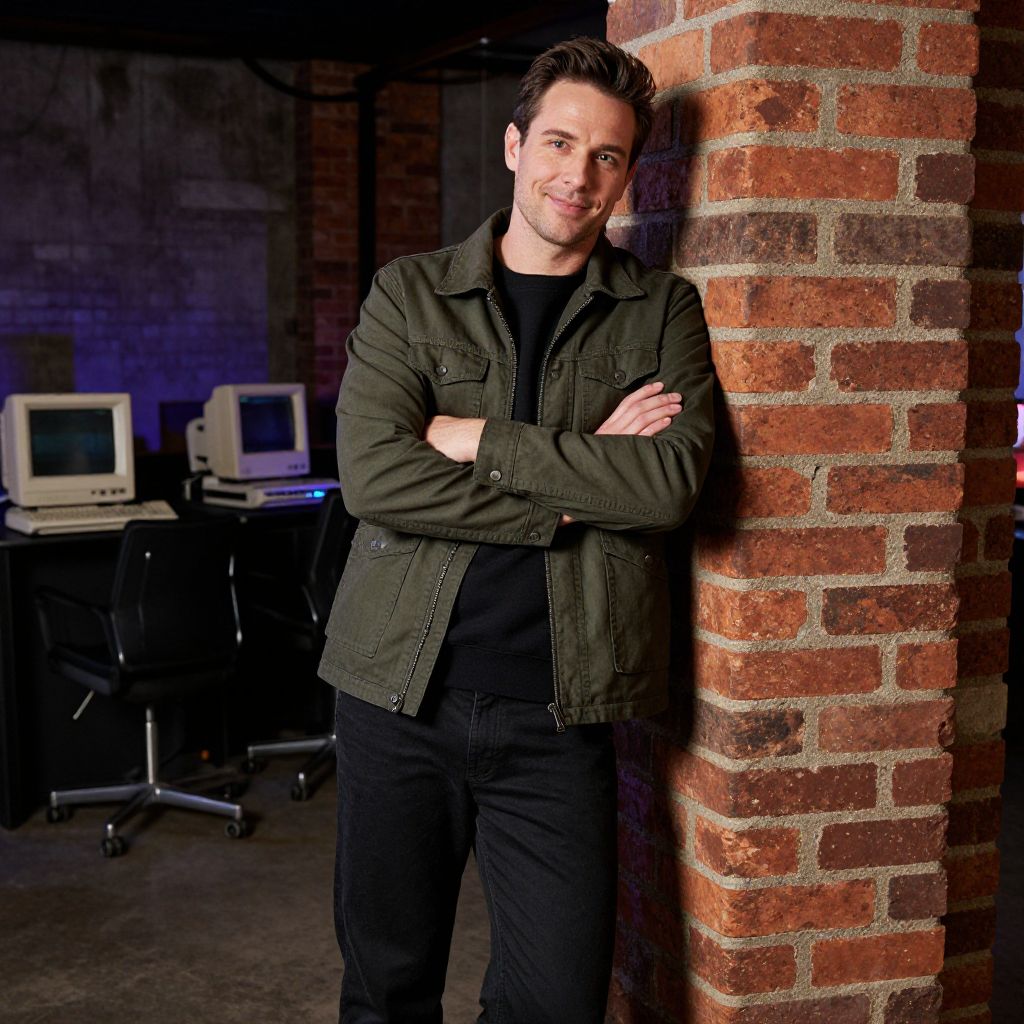 A confident man in a casual olive jacket and black jeans leans against a brick pillar inside a room with a vintage tech vibe. Behind him, two classic CRT computer monitors on desks add a nostalgic touch to the industrial-style setting.