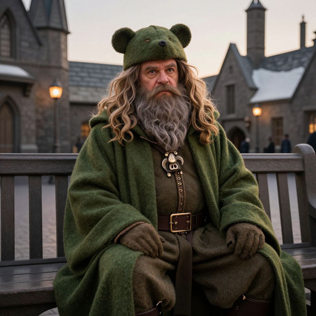 A man dressed in a detailed green cloak and bear-themed hat sits on a wooden bench in a medieval village setting. His long curly hair and full beard complement the fantasy-inspired costume, evoking a character from folklore or a fantasy film. The backdrop features stone buildings and warm evening lighting, enhancing the immersive atmosphere.
