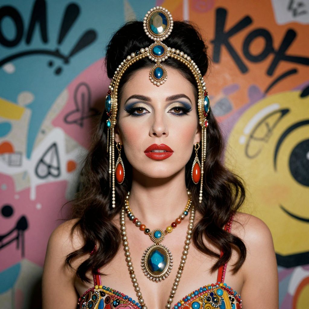 A woman with striking makeup poses against a vibrant graffiti backdrop, adorned in luxurious jewelry featuring large blue and red gemstones and intricate pearl detailing. Her elegant hairstyle and bold red lips complement the richly decorated costume, creating a dramatic and stylish portrait.