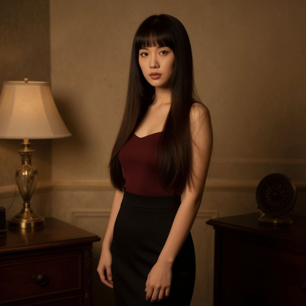 A young woman with long straight hair and bangs stands elegantly in a softly lit, classic interior room featuring warm tones and vintage wooden furniture. She wears a burgundy sleeveless top tucked into a black skirt, exuding a poised and contemplative mood with a subtle, natural makeup look.