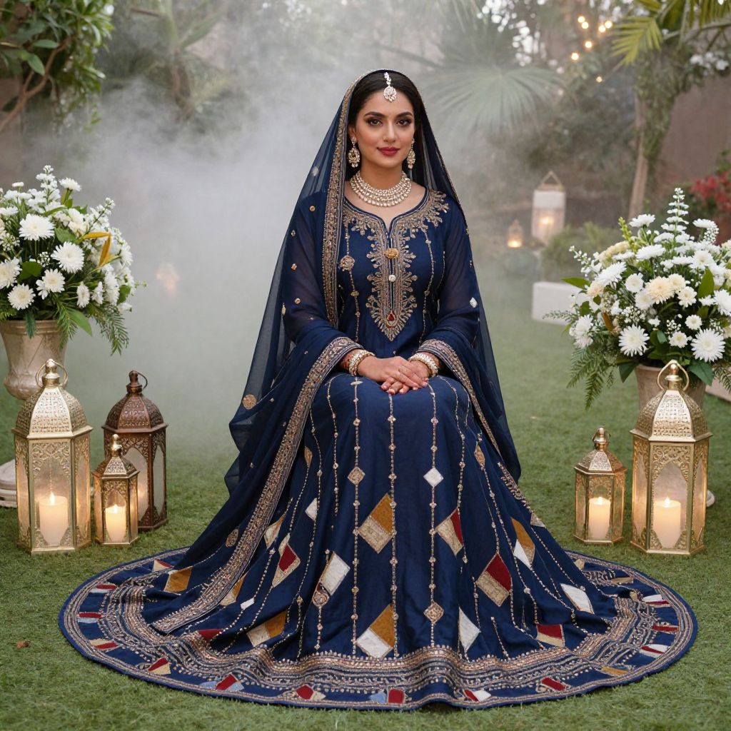 A woman dressed in an elegant, navy blue traditional outfit with intricate gold and geometric embroidery sits gracefully on a lush green lawn. The setting is adorned with vintage lanterns and white floral arrangements, creating a serene and festive ambiance.