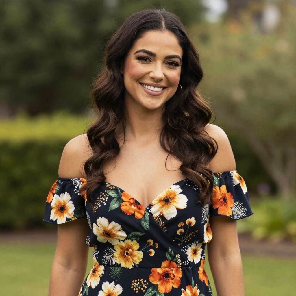 A smiling woman with long, dark wavy hair wears a vibrant off-the-shoulder dress decorated with orange and white floral patterns. She stands outdoors with a soft, blurred natural background, radiating a warm and cheerful vibe.