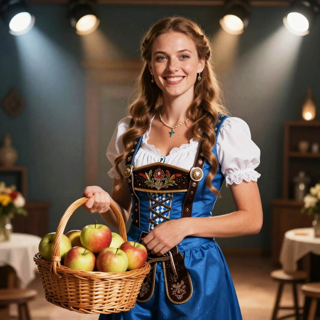 A smiling woman dressed in a traditional Bavarian Oktoberfest costume holds a wicker basket filled with fresh apples. The costume features a blue dirndl with intricate embroidery and lace details, set against a softly lit, rustic background that highlights the festive atmosphere.