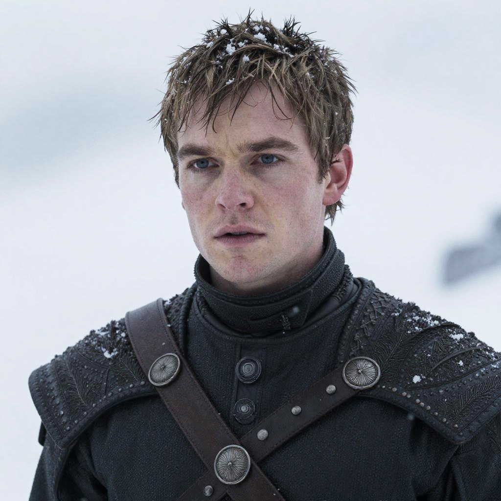 A close-up portrait of a man dressed in a detailed medieval outfit, standing in a snowy environment. His attire features intricate leather and metal embellishments, conveying a style reminiscent of the Game of Thrones series. The somber expression and snowflakes on his hair add to the dramatic and rugged atmosphere of the scene.