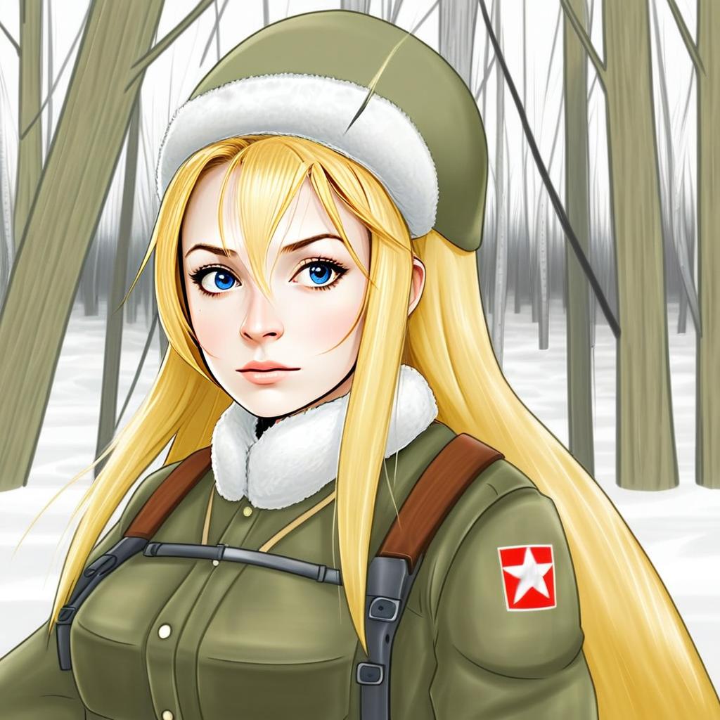 This digital anime-style illustration features a blonde woman dressed in a winter military uniform, set against a snowy forest background. The detailed artwork highlights her bright blue eyes and fur-lined hat, capturing a cold yet serene atmosphere evocative of the historical Mosin Nagant era with a modern anime aesthetic.