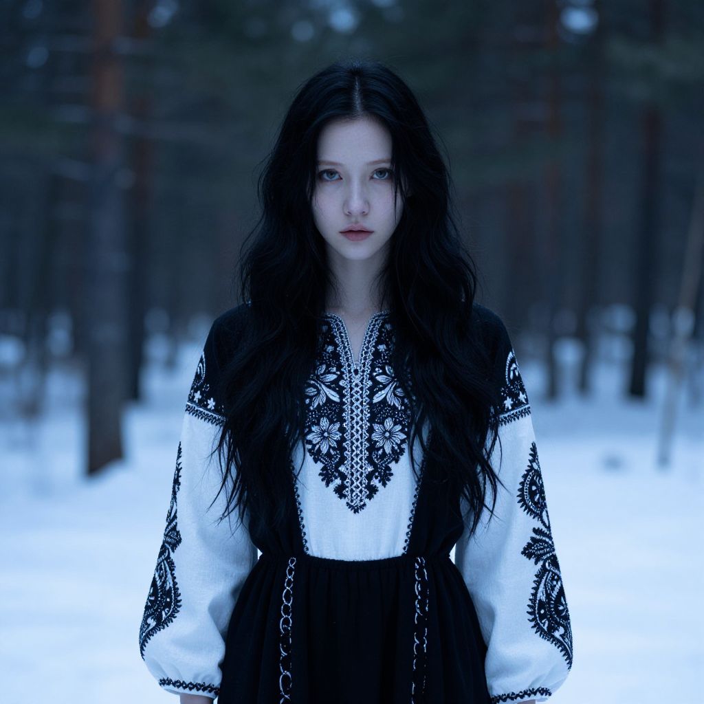 A young woman with long, dark hair stands in a snowy forest, wearing a traditional black and white embroidered dress. The serene, almost ethereal atmosphere is enhanced by the cool blue tones and soft focus on the trees in the background.
