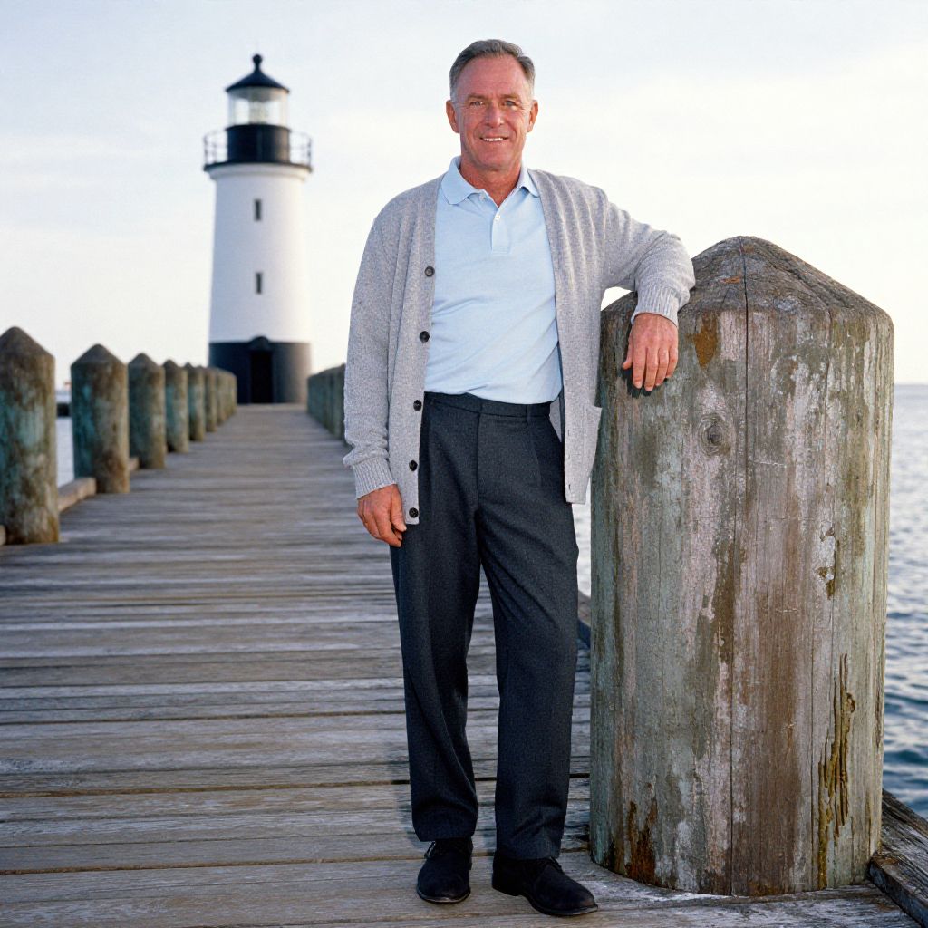 A mature man stands confidently on a wooden pier, leaning against a large weathered post with a black and white lighthouse in the background. The serene coastal setting and the man's relaxed pose create a peaceful and contemplative atmosphere.