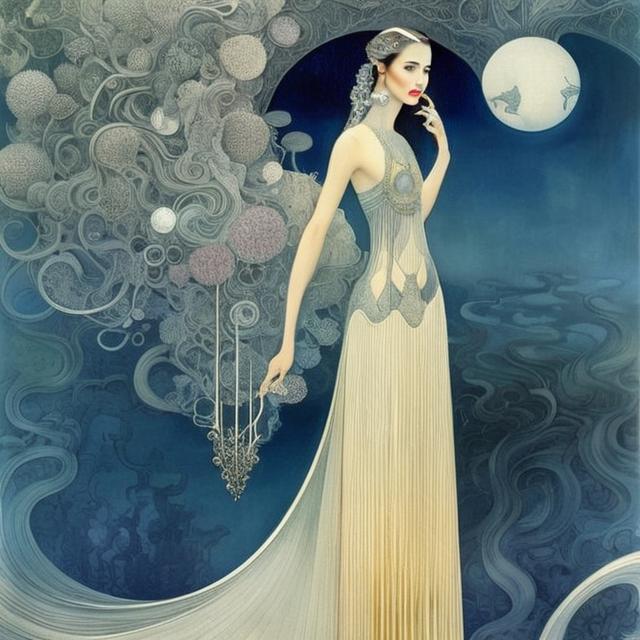 This elegant illustration features a woman dressed in a flowing, intricately designed gown that showcases a beautiful blend of soft colors and delicate patterns. The artwork captures a sense of grace and serenity, surrounded by whimsical floral elements, creating a dreamy atmosphere reminiscent of classical art styles.