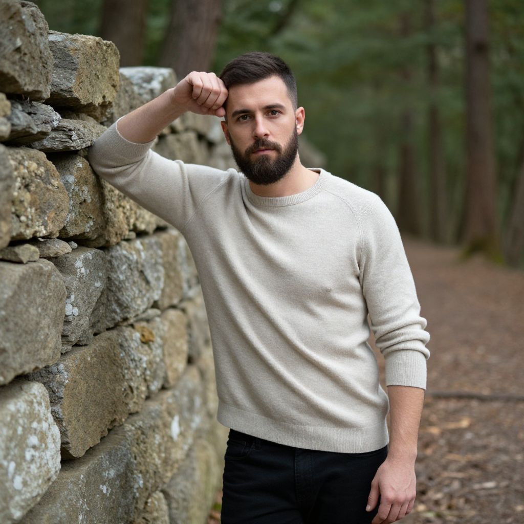 A young man with a neatly trimmed beard and short hair leans against a rustic stone wall in a tranquil forest setting. He wears a light beige sweater and black pants, exuding a casual yet thoughtful vibe amid the natural surroundings.