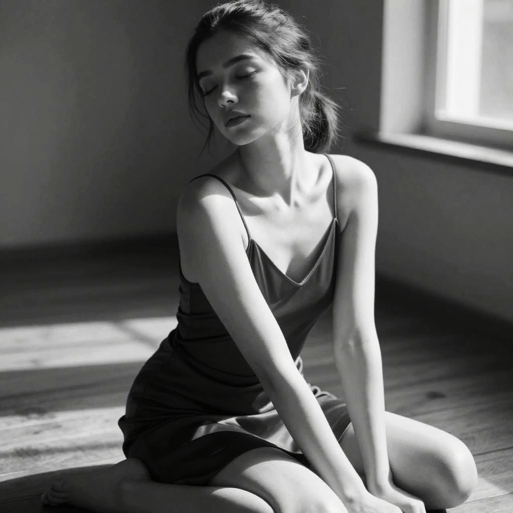 A young woman sits gracefully on a wooden floor in a softly lit room, wearing a sleek slip dress. The black and white photo captures her serene expression with closed eyes, evoking a timeless and contemplative mood. The natural light streaming through the window highlights the delicate texture of her skin and the smooth fabric, adding an artistic and minimalist touch.
