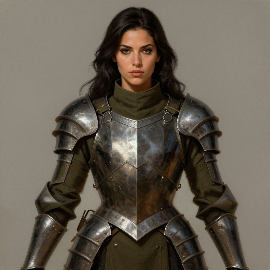 A confident woman wearing a polished medieval-style full plate armor stands against a neutral background, embodying strength and determination. The highly detailed armor reflects light subtly, complemented by her dark hair and serious expression, evoking a classical fantasy or historical aesthetic.