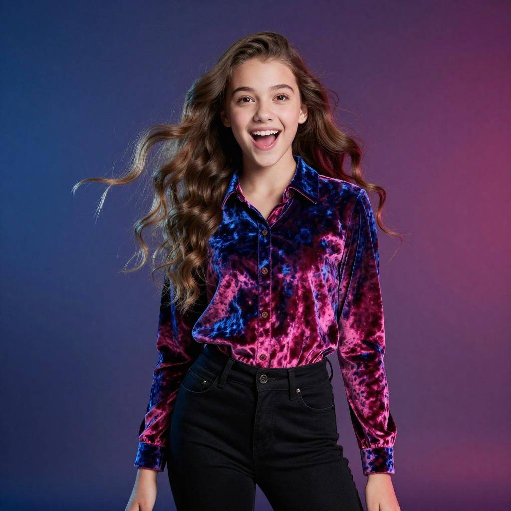 A cheerful young woman with long wavy hair poses against a gradient background of blue and purple hues. She wears a vibrant, tie-dye style velvet shirt in shades of blue and magenta, paired with high-waisted black pants, embodying a trendy and youthful look.