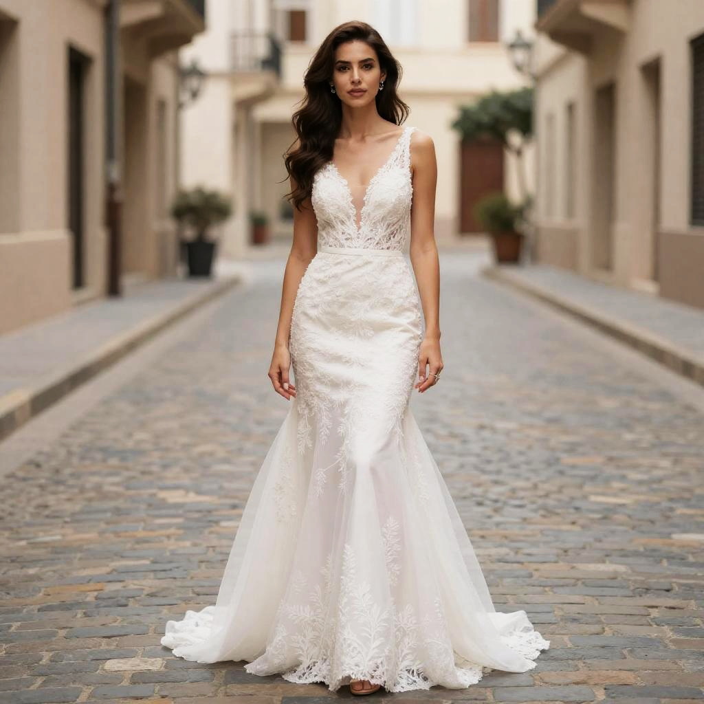 A woman stands confidently on a cobblestone street wearing an elegant, lace mermaid-style wedding dress with a deep V neckline. The soft tulle and intricate floral patterns enhance the romantic and sophisticated vibe, perfect for a pre-wedding photoshoot.