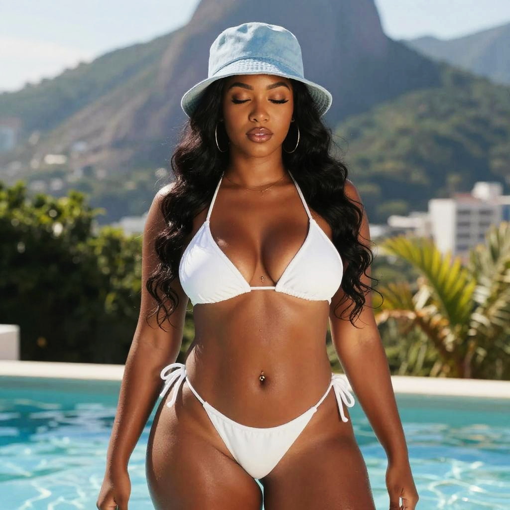 A confident woman stands at the edge of a pool, wearing a stylish white bikini and a light blue bucket hat. The serene background features lush greenery and distant mountains under a bright, clear sky, capturing a relaxed, tropical vibe.