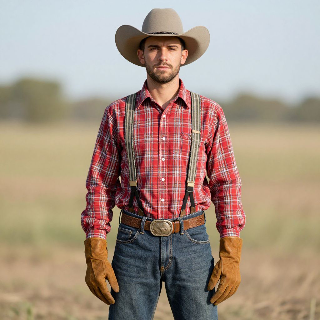 A young man dressed as a cowboy stands confidently outdoors in a rural setting, wearing a beige cowboy hat, red plaid shirt, suspenders, leather gloves, and a decorative belt buckle. The natural background is softly blurred, emphasizing his traditional western look and rugged style.