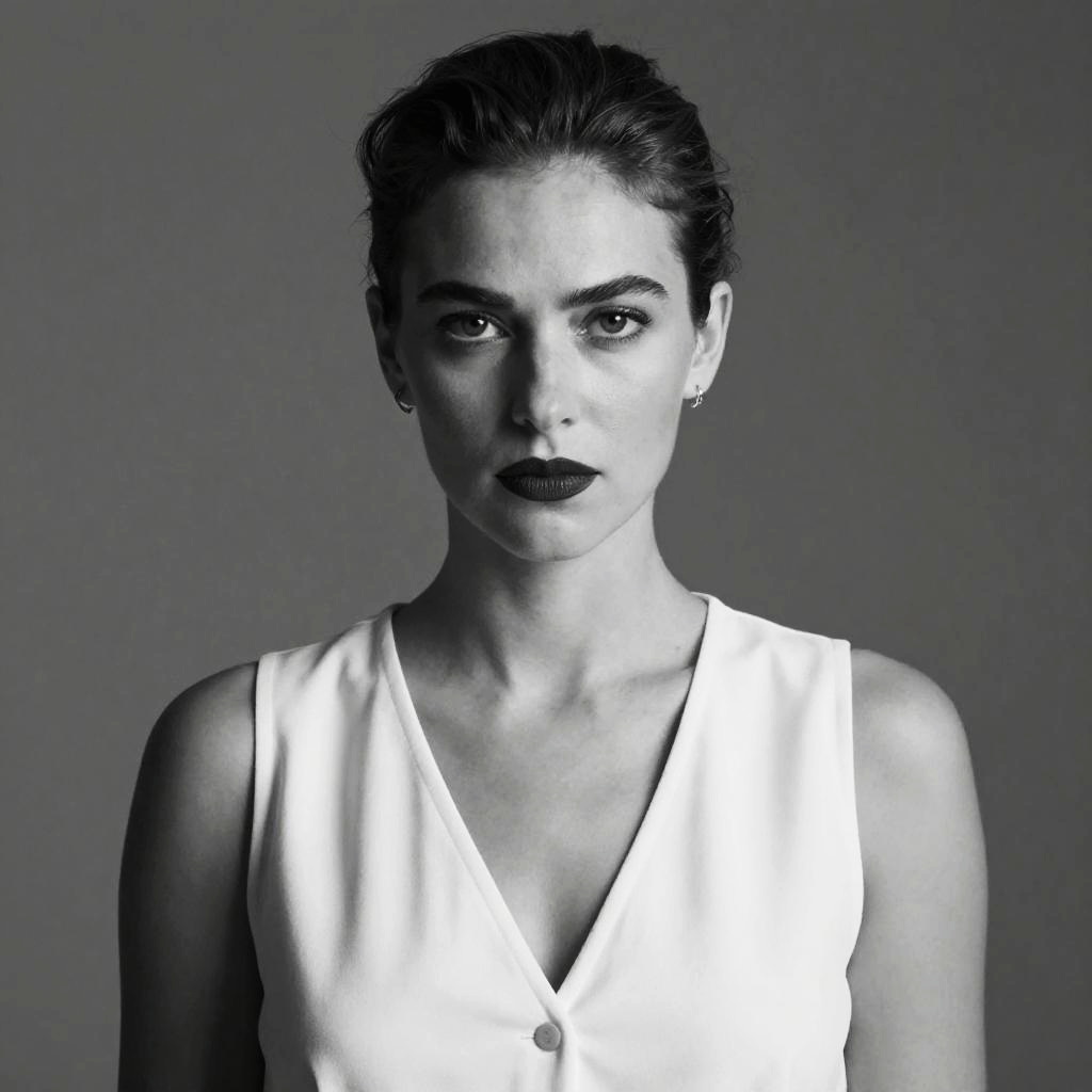 A striking black and white portrait of a young woman with an intense gaze, embodying a modern yet timeless style. Her dark lipstick and minimalistic white top enhance the dramatic, high-contrast aesthetic typical of contemporary fashion photography.