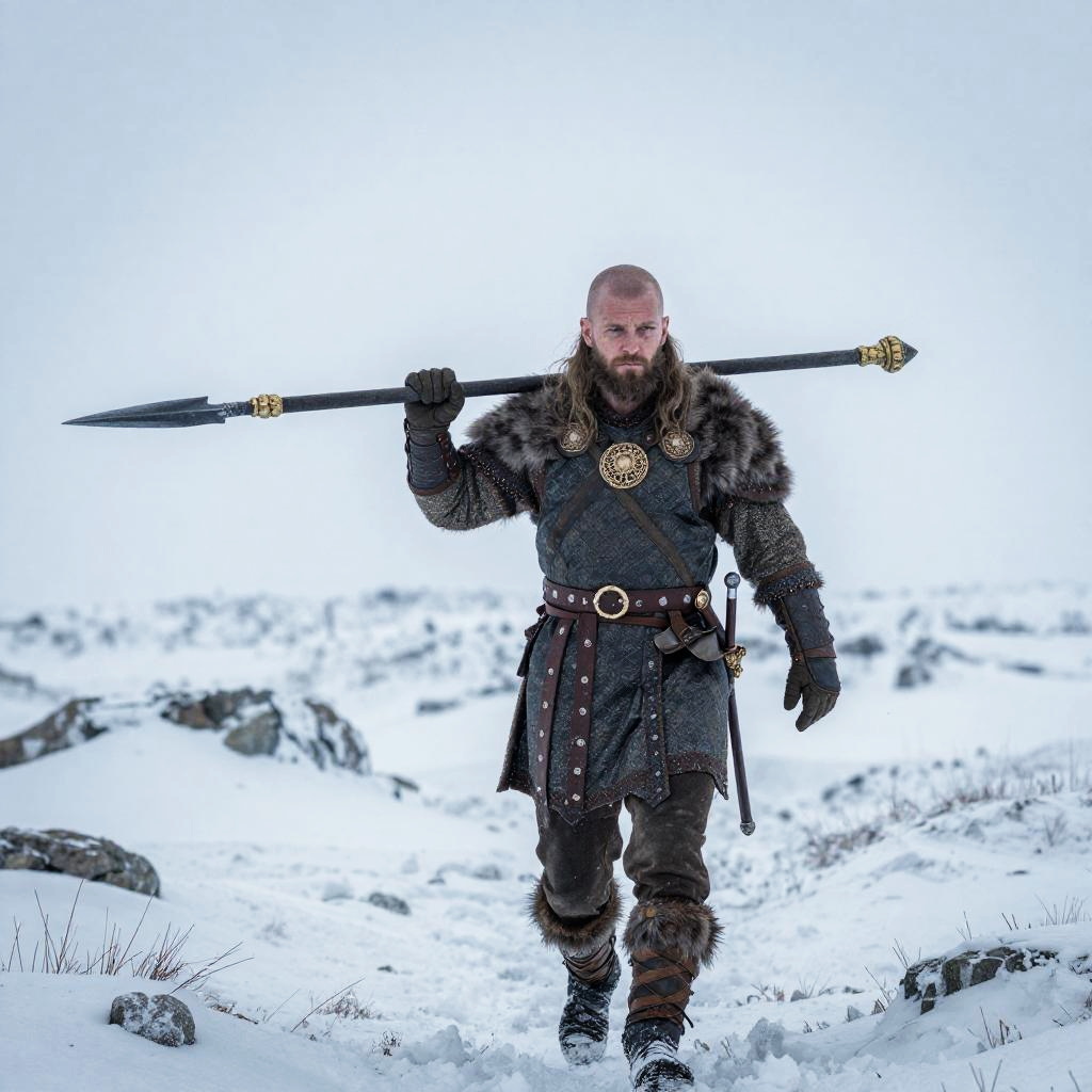 Viking Warrior in Snowy Landscape Holding Spear