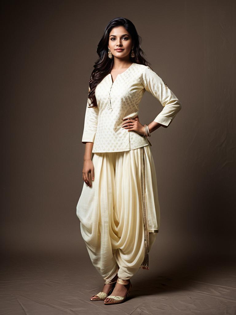 A woman poses gracefully in a photorealistic studio portrait wearing a traditional Indian dhoti suit salwar in a soft ivory tone. The outfit features intricate patterns on the kurta paired with flowing dhoti-style pants, embodying contemporary ethnic fashion with elegant and detailed styling.