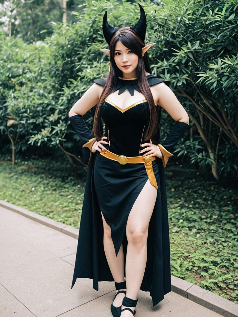 A confident woman dressed in a dark fantasy-inspired costume poses outdoors surrounded by lush greenery. Her outfit features black and gold accents, including a high-slit skirt, cape, long gloves, and distinctive horned headpiece with elf ears, embodying a powerful sorceress or demoness character.
