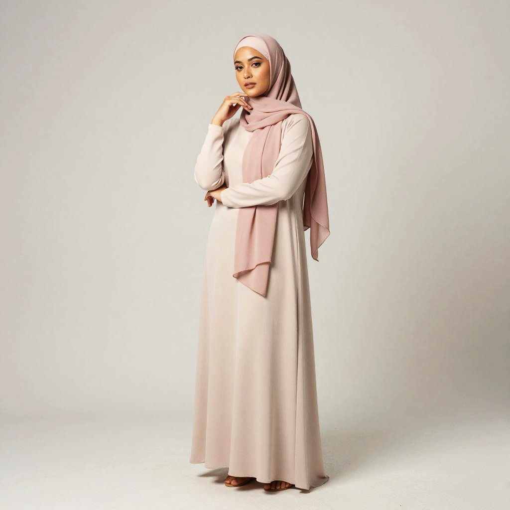 Elegant Woman Wearing Beige Abaya and Blush Pink Hijab in Modern Modest Fashion