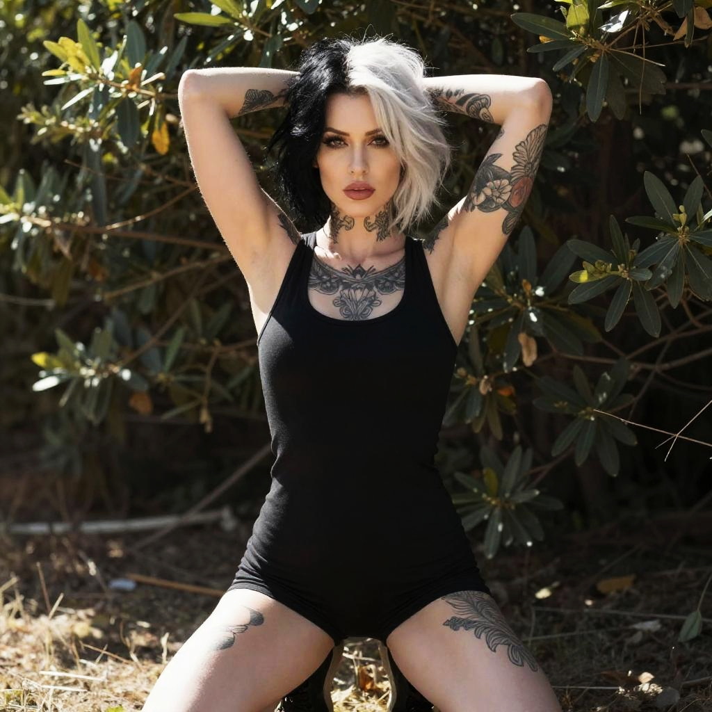 A confident woman with distinctive half-black, half-white hair poses outdoors in a black sleeveless outfit, showcasing her detailed tattoos on her arms, chest, and thighs. The natural background of leafy plants adds contrast to her bold alternative style and striking appearance.