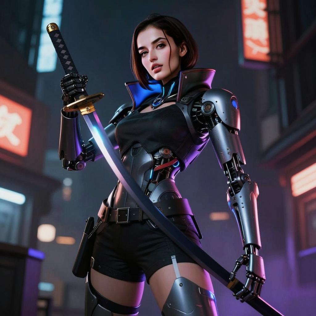 A futuristic woman warrior with sleek cybernetic arms stands confidently in a neon-lit urban environment, wielding a traditional katana sword. This high-tech cyberpunk scene highlights the combination of advanced robotics and classic weaponry, showcasing a strong female character in a stylish, dystopian city.
