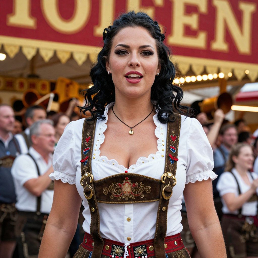 A smiling woman dressed in traditional Bavarian attire, featuring a white blouse and ornate brown leather lederhosen with embroidered details. She stands in front of a festive background with blurred people, suggesting a lively cultural event or festival.
