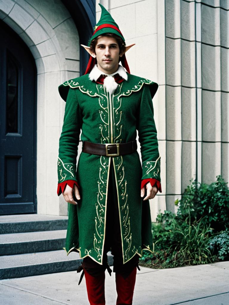 A man stands outdoors dressed in a detailed fantasy elf costume featuring a green tunic with golden embroidery, a matching pointed hat, and red accents. The outfit includes elf ears and a wide belt, capturing a classic fantasy style often seen in medieval-inspired costume design.