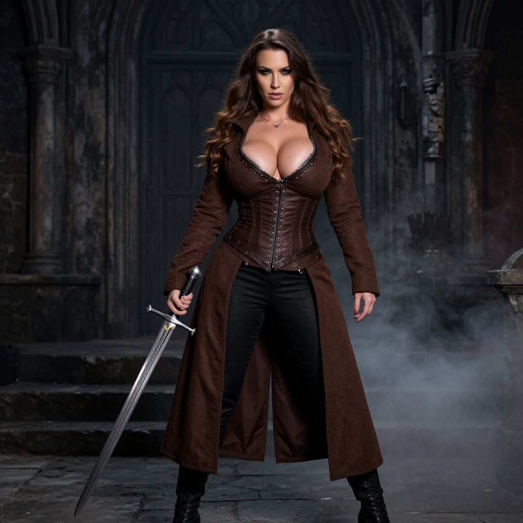 A confident woman dressed in a medieval-inspired brown coat and corset stands holding a long sword, set against a dark, gothic architectural background with mist creating a dramatic atmosphere. The image captures a strong fantasy warrior vibe with detailed costume and intense expression.