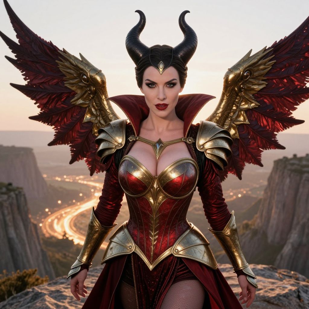 A fierce woman dressed in an elaborate fantasy costume with golden armor and red accents, featuring large horns and majestic dark red wings. She stands confidently against a dramatic mountainous landscape at sunset, evoking a powerful dark fantasy or villainous character style.