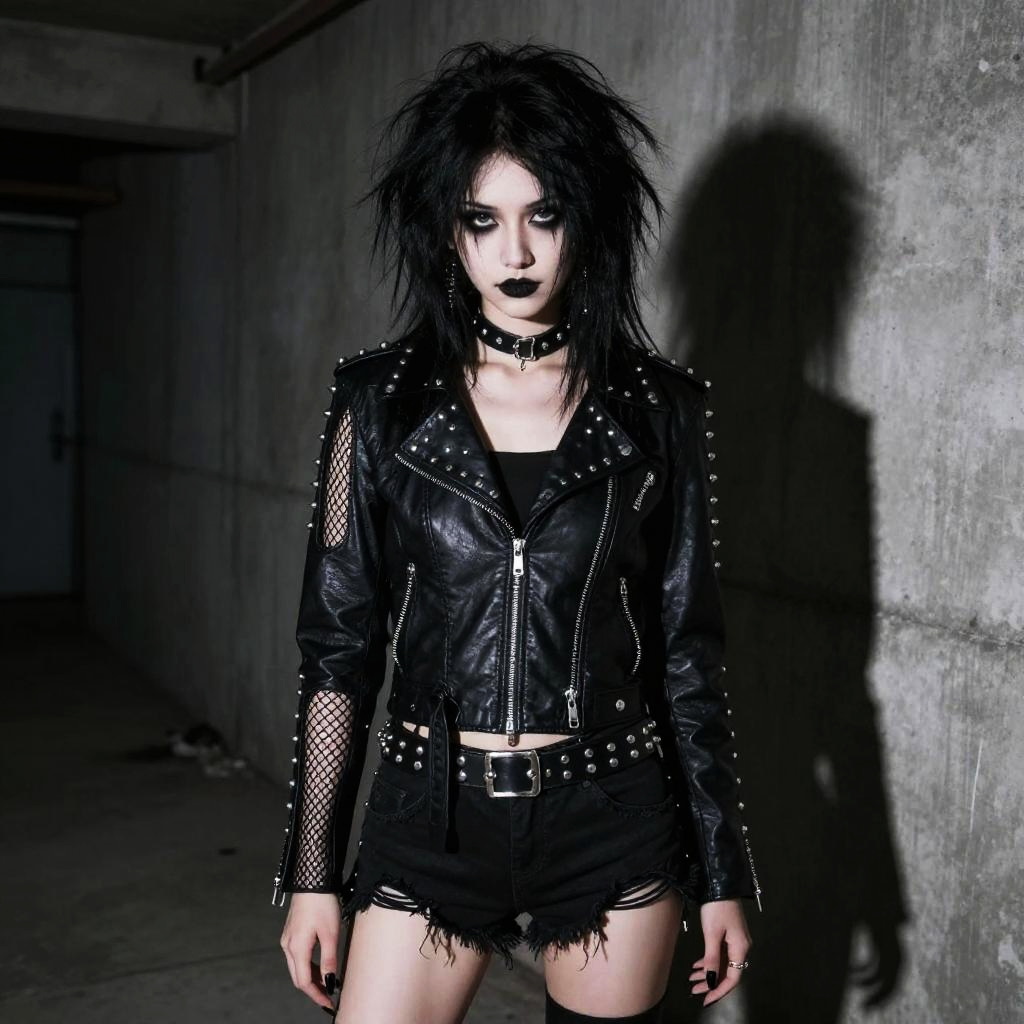 A woman exuding a fierce punk rock vibe stands against a concrete wall, dressed in a black leather jacket adorned with studs and paired with ripped shorts and fishnet sleeves. Her wild hair and bold dark makeup contribute to the edgy, rebellious aesthetic, embodying a classic goth and punk style.