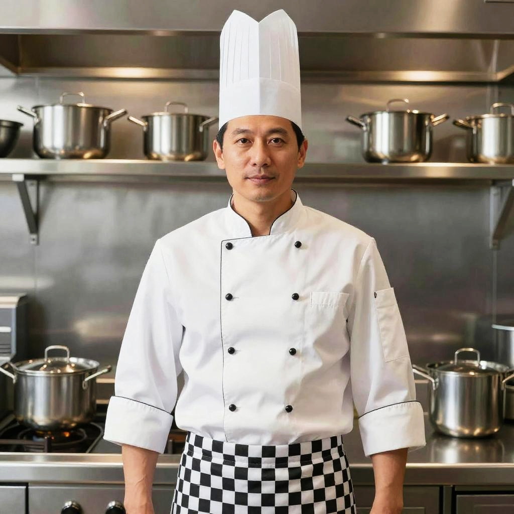 A professional male chef stands confidently in a modern commercial kitchen, dressed in a classic white double-breasted chef coat and tall white chef hat. Stainless steel pots and pans are neatly arranged on the stove and shelves behind him, highlighting a clean and organized culinary workspace.