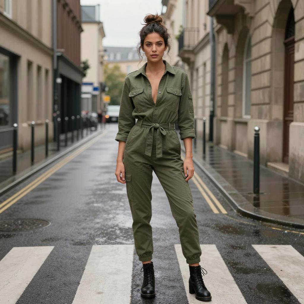 A confident woman stands in the middle of a wet urban street wearing a stylish olive green utility jumpsuit with rolled-up sleeves and black lace-up boots. The contemporary street style outfit, combined with her natural makeup and messy bun hairstyle, highlights a modern and effortlessly chic look.