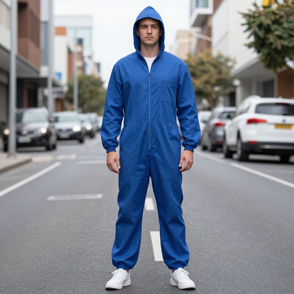 A man stands confidently in the middle of an urban street wearing a blue hooded coverall with elastic cuffs and white sneakers. The image captures a modern, casual workwear style in a city environment, emphasizing practical and comfortable clothing.