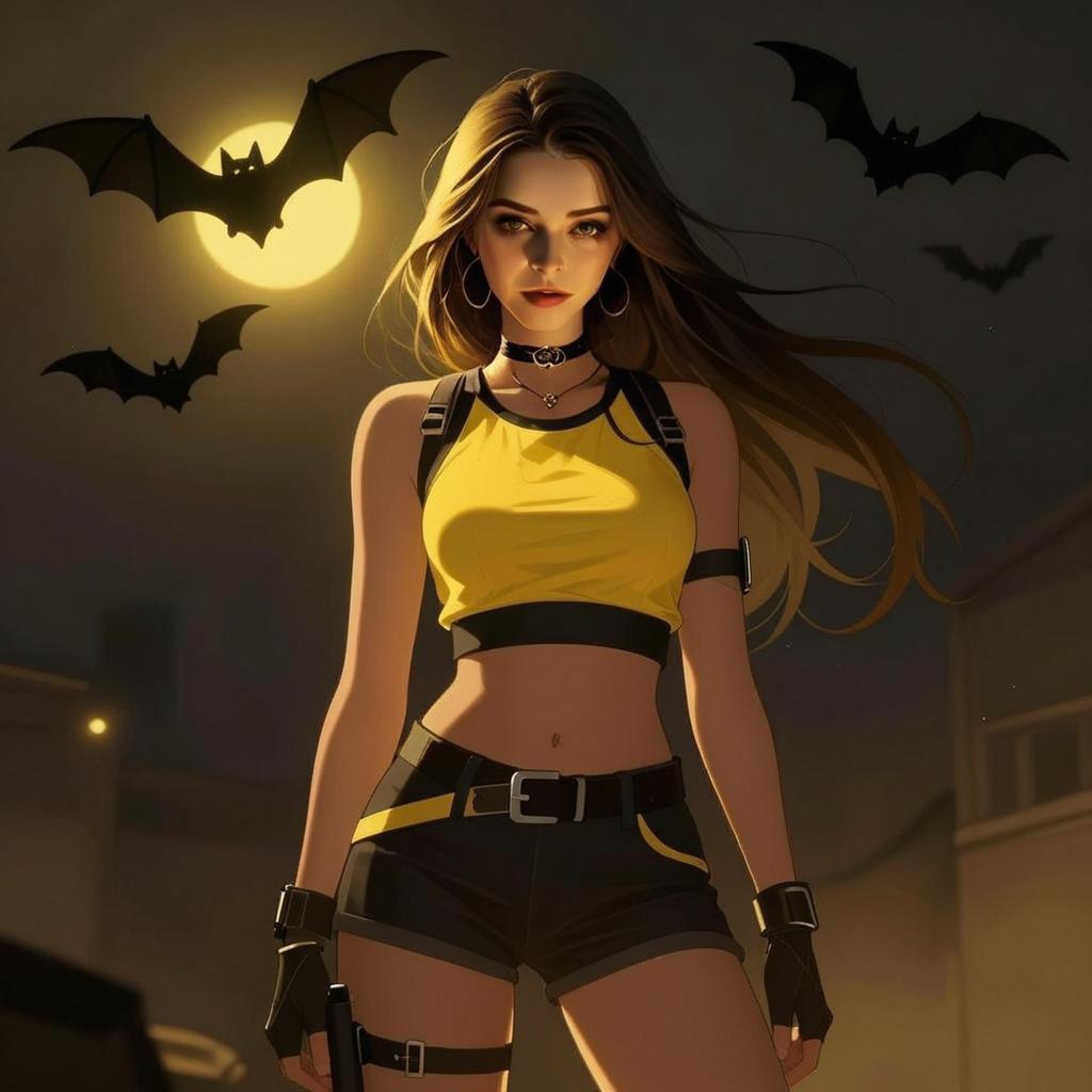 A confident young woman stands under the glowing full moon with bats flying in the night sky, showcasing a modern stylish outfit featuring a yellow crop top and black shorts with edgy accessories. The digital artwork combines elements of contemporary fashion with a dark, mysterious atmosphere, enhanced by the glowing moonlight and dynamic hair movement.