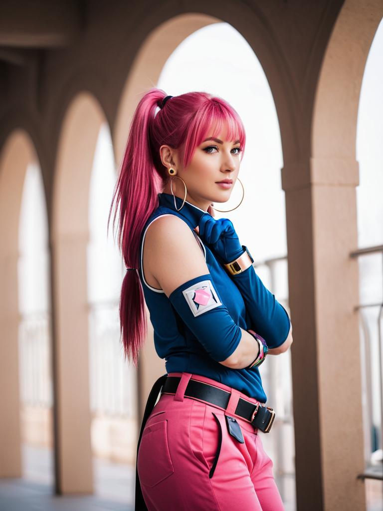 A confident woman with vibrant pink hair styled in a high ponytail poses in a modern archway setting, wearing a stylish blue sleeveless top and matching gloves paired with pink pants. The outfit and pose evoke a contemporary, fashion-forward vibe with bold colors and accessories, highlighting a strong and edgy aesthetic.
