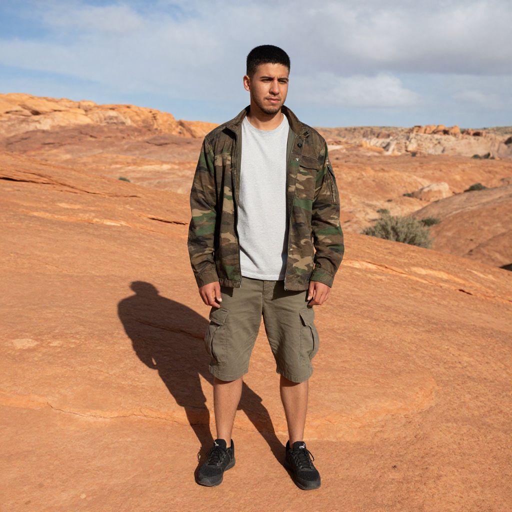 A young man stands confidently on a rocky desert landscape under a partly cloudy sky. He is dressed in casual outdoor attire, including a camouflage jacket, gray t-shirt, cargo shorts, and black sneakers, blending rugged fashion with a natural setting.