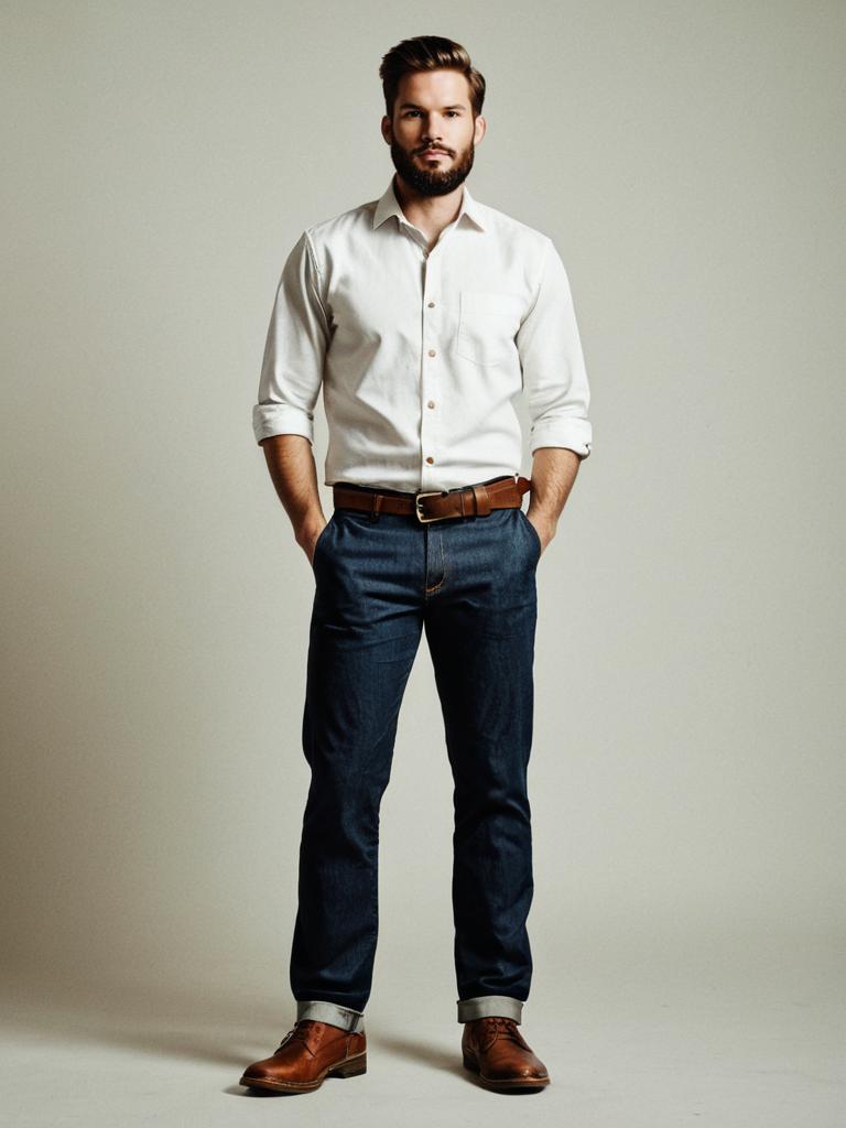 Man in Formal Pants and White Shirt with Brown Leather Belt and Shoes