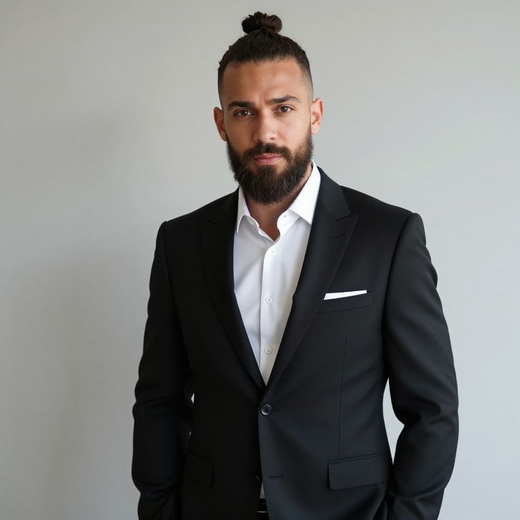 Confident Man in Black Suit with Beard and Top Knot Hairstyle