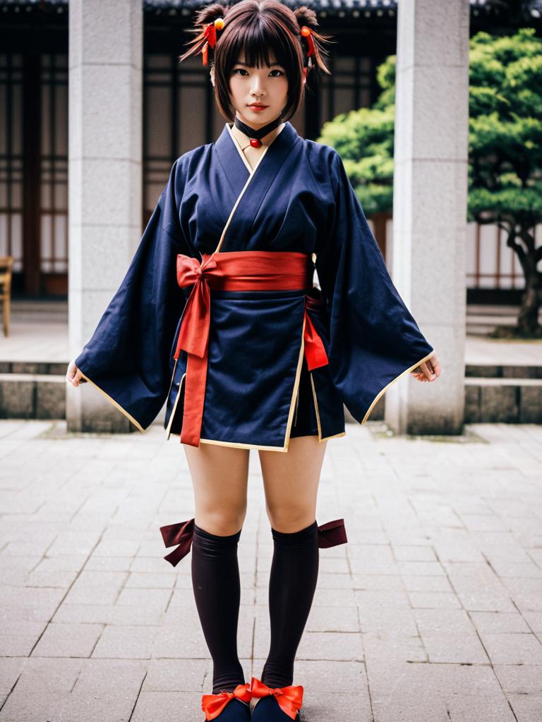 A woman dressed in a detailed cosplay outfit inspired by Mumei from the anime 'Kabaneri of the Iron Fortress.' She wears a traditional-style navy blue kimono with red accents and black knee-high socks, standing in a Japanese architectural setting. The photograph captures a blend of authentic cultural attire with modern anime character design in a realistic photographic style.