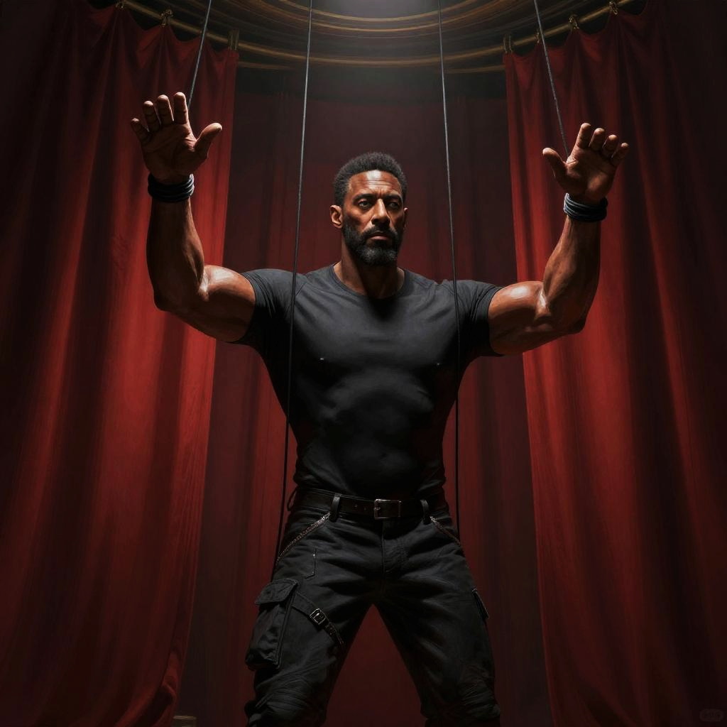A muscular man stands against a backdrop of deep red curtains, posed like a human marionette with strings attached to his wrists. His focused expression and dark attire add a dramatic and intense atmosphere to the theatrical setting.