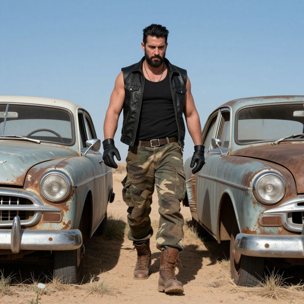 A rugged man with a beard and intense expression walks confidently between two vintage, rusted cars in a desert setting. He is dressed in a black sleeveless leather vest, camo pants, combat boots, and black gloves, evoking a tough, post-apocalyptic or biker-inspired style.