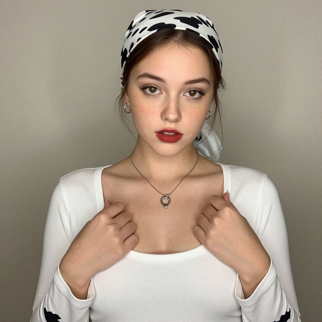 A young woman poses against a neutral background, wearing a white top with black pattern details on the sleeves. She accessorizes with a silver necklace and hoop earrings, while her hair is styled back with a black and white patterned headscarf. The image highlights her natural makeup look with soft brown eyeshadow and a bold red lip.